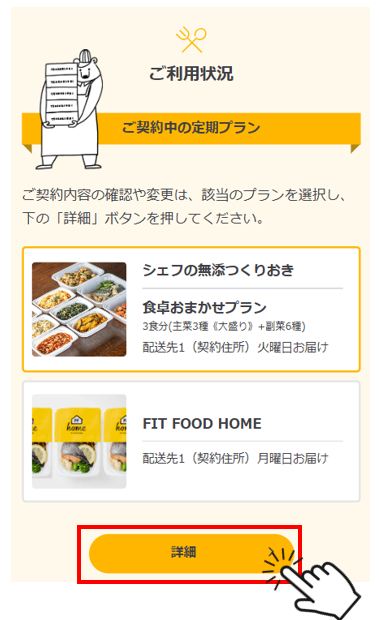 定期配送の休止(解約)は<契約状況>ページにて休止を希望の定期配送メニューを選択し、「詳細」をタップ
