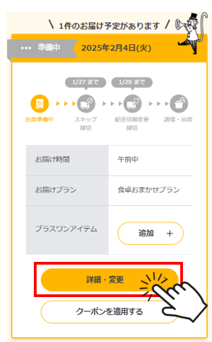 定期配送の休止(ご解約)は契約状況】ページより承っております。休止をご希望の定期配送を選択し、「詳細」をタップ