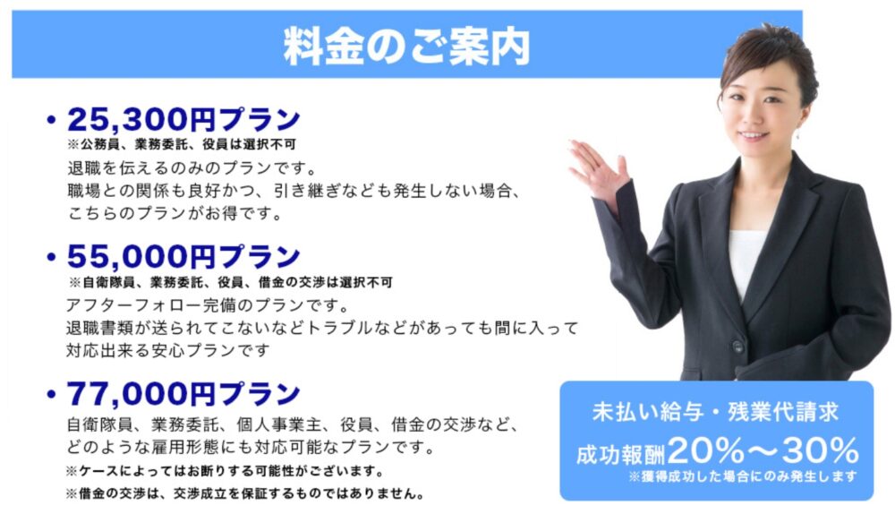 | オプション費用 | ・回収額の20%~30%(残業代・未払い給与など) ・損害賠償等の裁判費用等 |